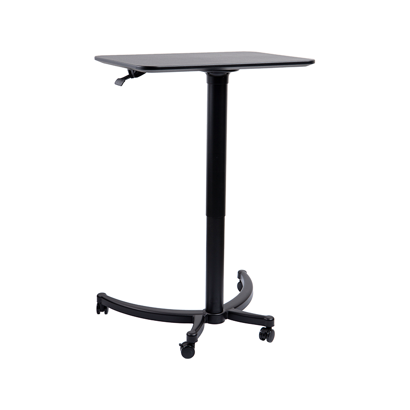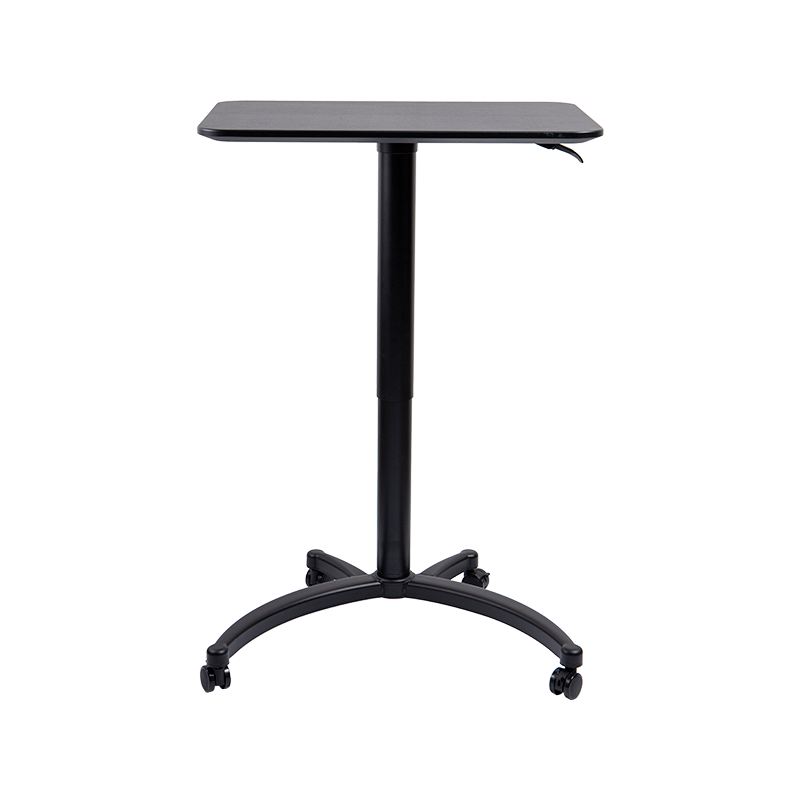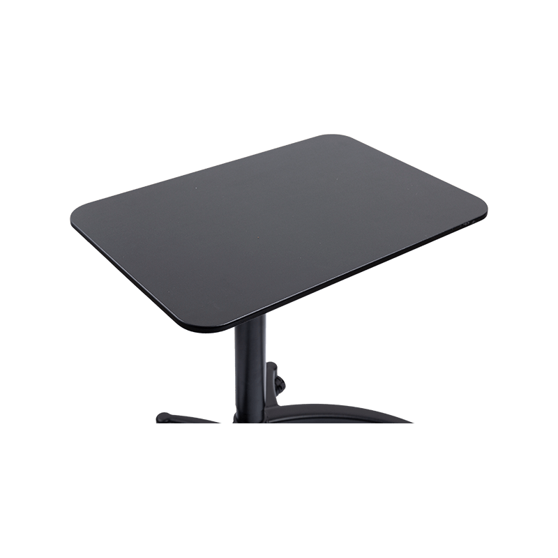 El escritorio utiliza un mecanismo de resorte de gas integrado para ajustar la altura. Los usuarios pueden configurar manualmente el escritorio para que permanezca a cualquier altura dentro de un rango vertical de 720 mm a 1130 mm. Este mecanismo de elevación funciona sin electricidad, lo que da como resultado una construcción relativamente simplificada. El escritorio presenta un diseño cuadrado, que mide 715 mm de largo y 495 mm de ancho, ofreciendo una superficie de trabajo plana. La estructura principal está construida con aluminio y hierro, terminada con un proceso de recubrimiento en polvo disponible en opciones de color blanco y negro. La base está equipada con cuatro ruedas, dos de las cuales incluyen funciones de bloqueo, lo que facilita una fácil movilidad y un posicionamiento seguro cuando está parado.